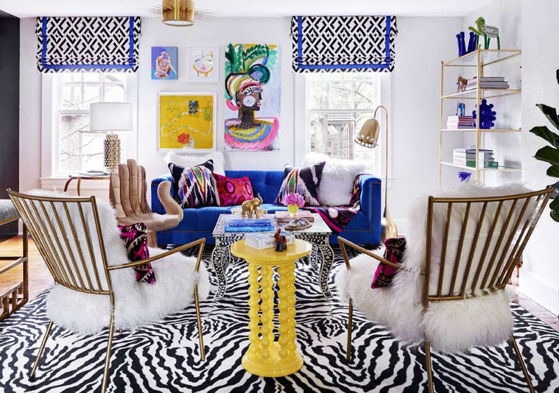 In this historic 1930s home white walls a tan leather sofa and pale hardwood floors are offset by kelly green armchairs graphic patterned pillows and an ocean blue area rug. While the term pop of color could mean any myriad of things from a statement wall to a festive carpet the concept at its core is genius. Black and white living room design.
